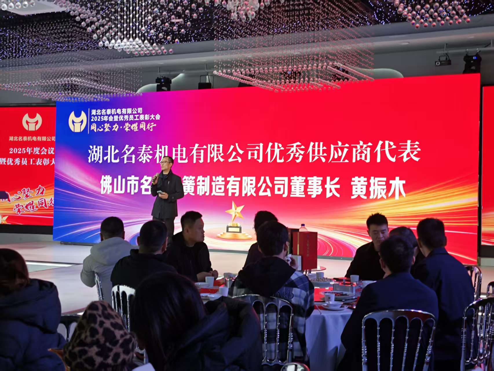 近日,湖北名泰機電有限公司2025年會暨優(yōu)秀員工表彰大會隆重舉行,現(xiàn)場氛圍熱烈,掌聲雷動。我司(佛山市名汽彈簧制造有限公司)憑借25載的誠信履約、品質(zhì)堅守與高效服務(wù),榮獲“優(yōu)秀供應(yīng)商”稱號,公司代表黃振木先生受邀出席大會,并作為優(yōu)秀供應(yīng)商代表上臺發(fā)表感言,傳遞合作初心,共繪發(fā)展藍(lán)圖。